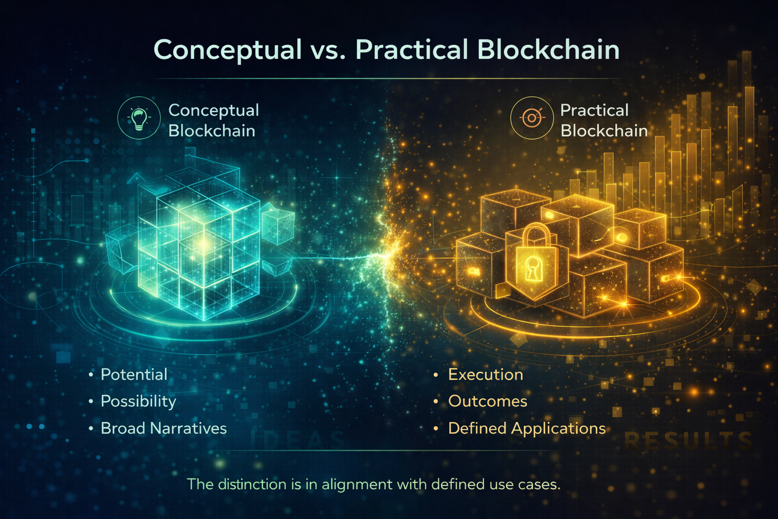 The difference between conceptual blockchain and practical blockchain. Conceptual blockchain focuses on possibility. It emphasizes what the technology could enable, often without reference to constraints, integration, or specific use cases. This perspective is useful in early stages of development, but it does not necessarily translate into adoption.